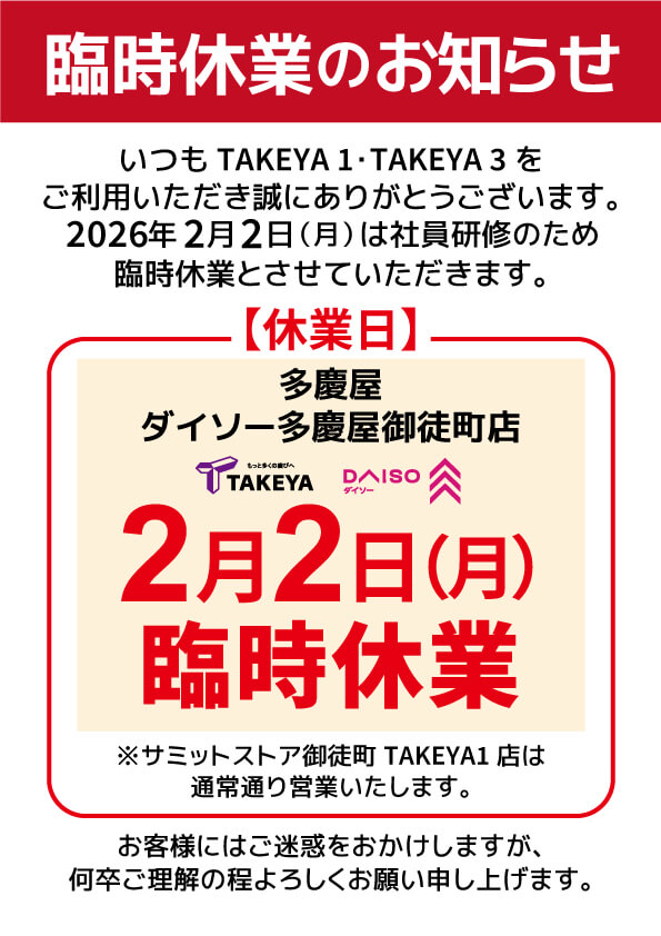 2026年2月2日(月)は社員研修のため臨時休業とさせていただきます。