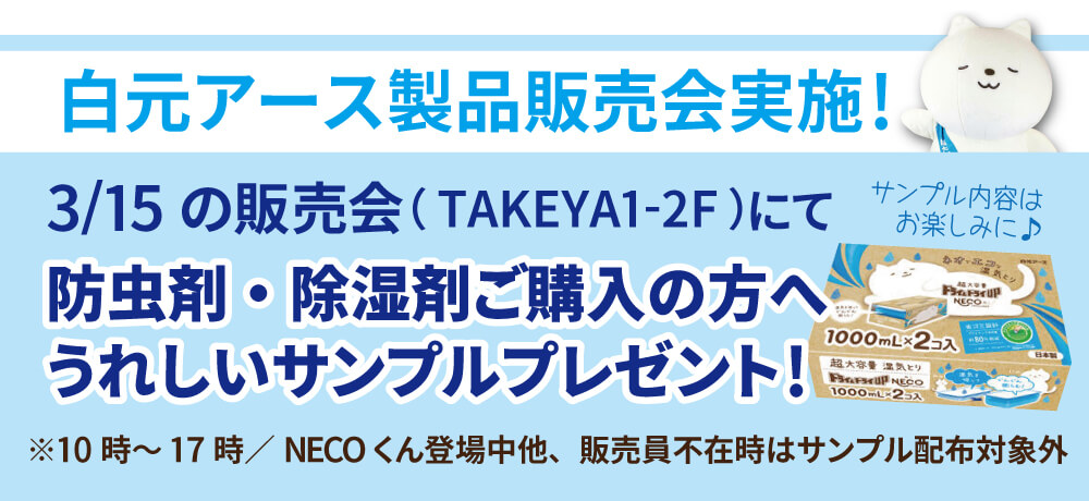 3/15(日)TAKEYA1-2Fで実施する白元アース製品販売会で、