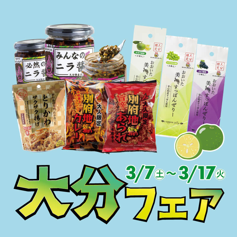全国一の生産量を誇るかぼすを使った商品をはじめ、大分県自慢の美味しいものが大集合