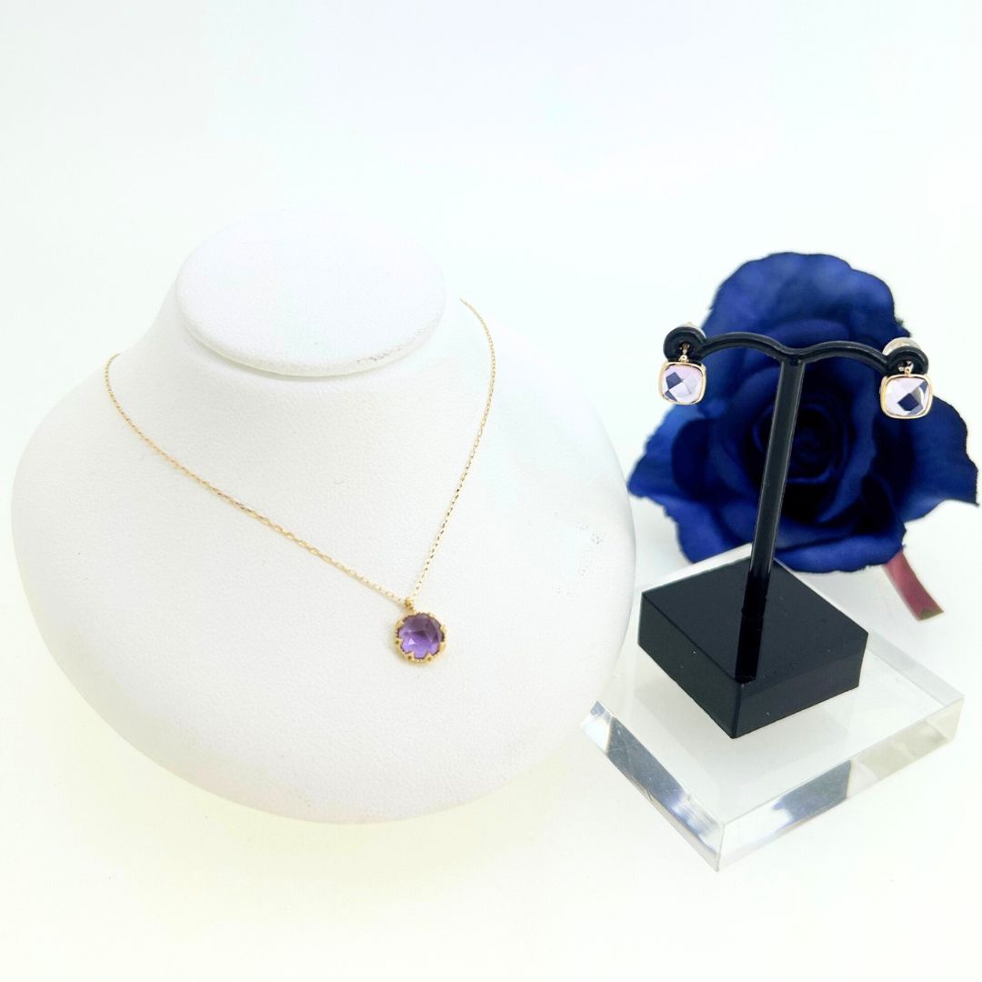 計算された無数の面が光を捉え、動くたびに宝石の奥底から強い輝きを放つ多面カットのアメジスト。深みのあるパープル、淡いパープルなどお好きなカラーを楽しめるのもアメジストならでは。 シンプルな装いさえも華やかにクラスアップしてくれます。