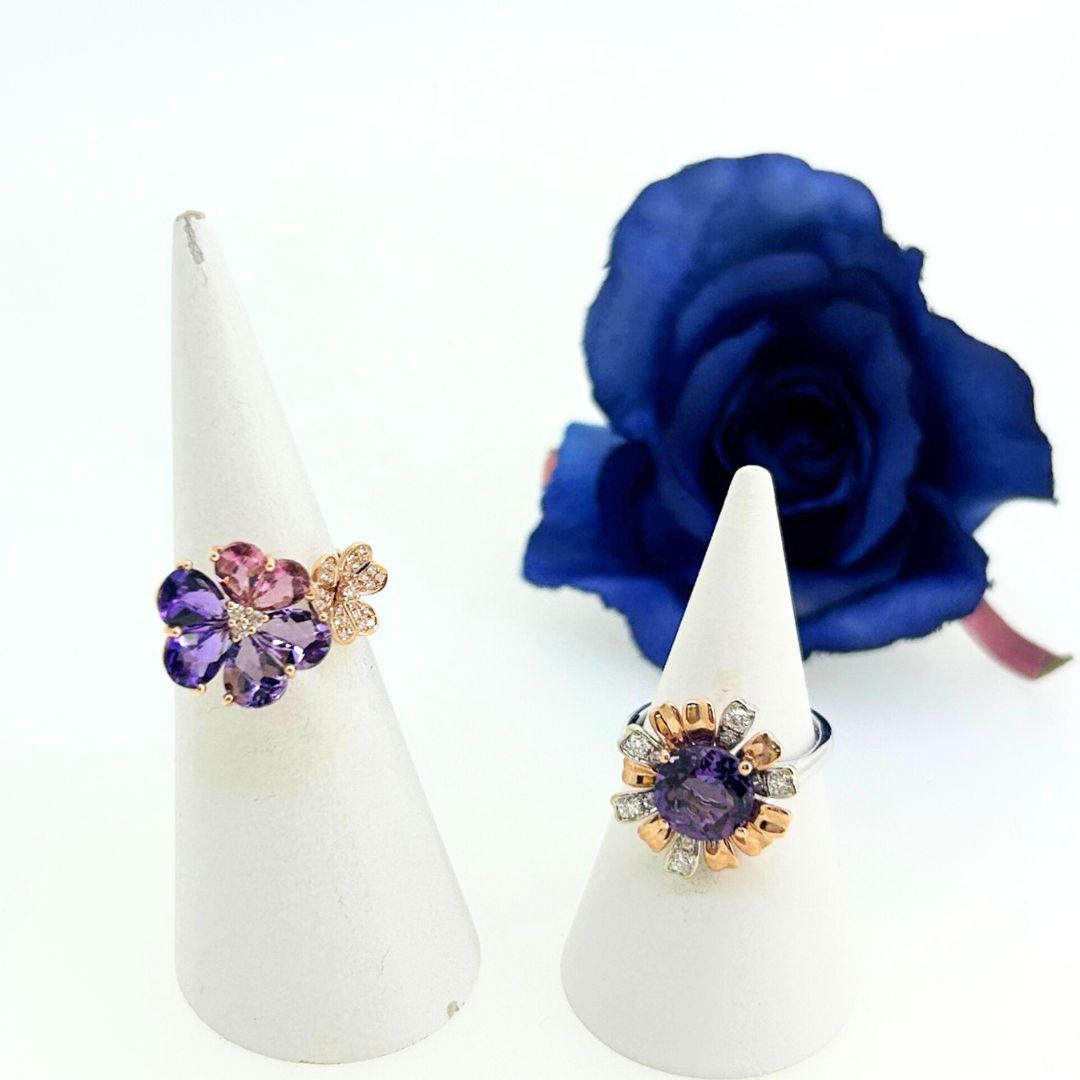 柔らかな花びらをアメジストやピンクゴールドの地金で表現した、愛らしいフラワーリング。 高貴なパープルが甘さを程よく抑え、大人の女性にふさわしい「品のある可愛らしさ」を演出します。 繊細にセットされたアメジストが、手元を動かすたびに優しく煌めき、指先に花が咲いたような華やかさを添えてくれます。