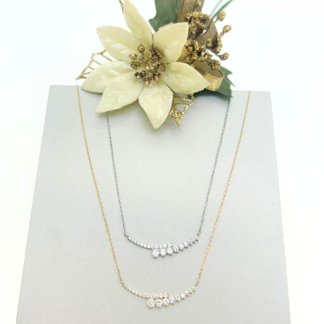シンプルでありながら、ダイヤモンド一つ一つが放つ光を最大に引き出すラインデザイン。肌の上で流れるような輝きは、顔周りをパッと明るく見せ、着るものを選ばない最高の洗練を演出します。初めてのダイヤモンドジュエリーにも最適です。