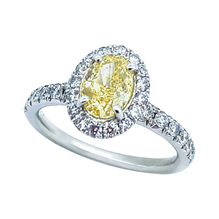 彩度が高く、明るい色味を持つ「ファンシーインテンスイエローダイヤモンド」は太陽のような鮮やかな黄色が魅力的です。取り巻きのダイヤモンドが1ctのイエローダイヤモンドを際立たせ、より大きく豪華にみせてくれます。
