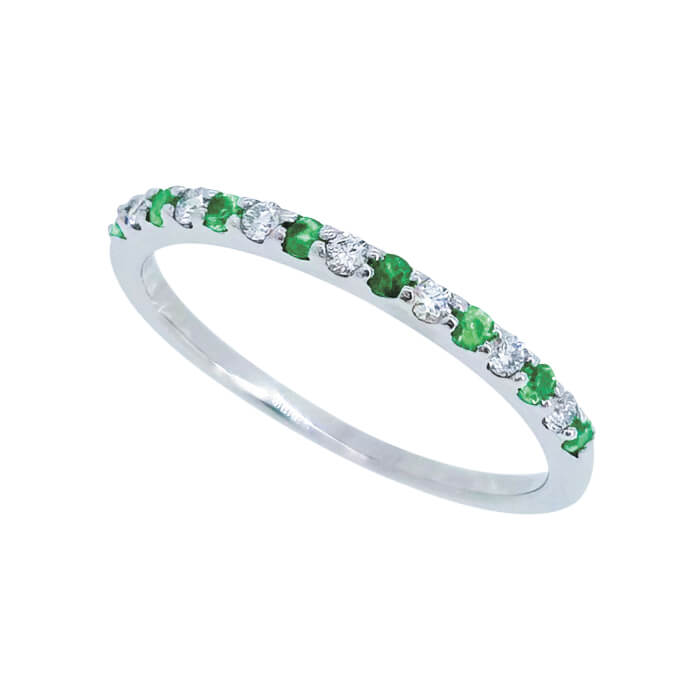 無色透明のダイヤモンドの強い輝きと、鮮やかなエメラルドの緑色が交互に並んだエタニティリング。単色では出せない美しいコントラストが魅力的で、重ね付けにもおすすめです。