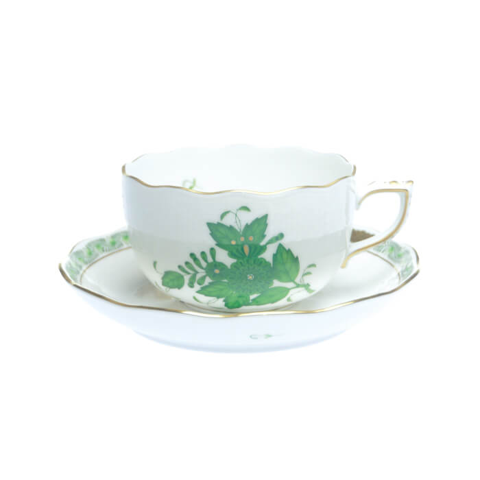 「アポニー・グリーン」は、単色のグリーンと金彩のみで描かれています。東洋的なモチーフでありながら、モダンで都会的な印象を与え現代のテーブルにも馴染みやすいデザインです。