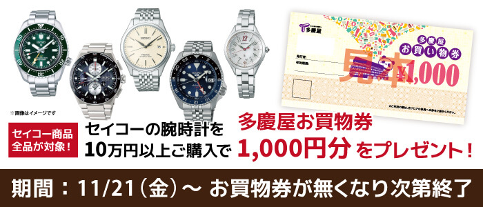 セイコーの腕時計を10万円以上ご購入で、多慶屋お買い物券1,000円分をプレゼント♪