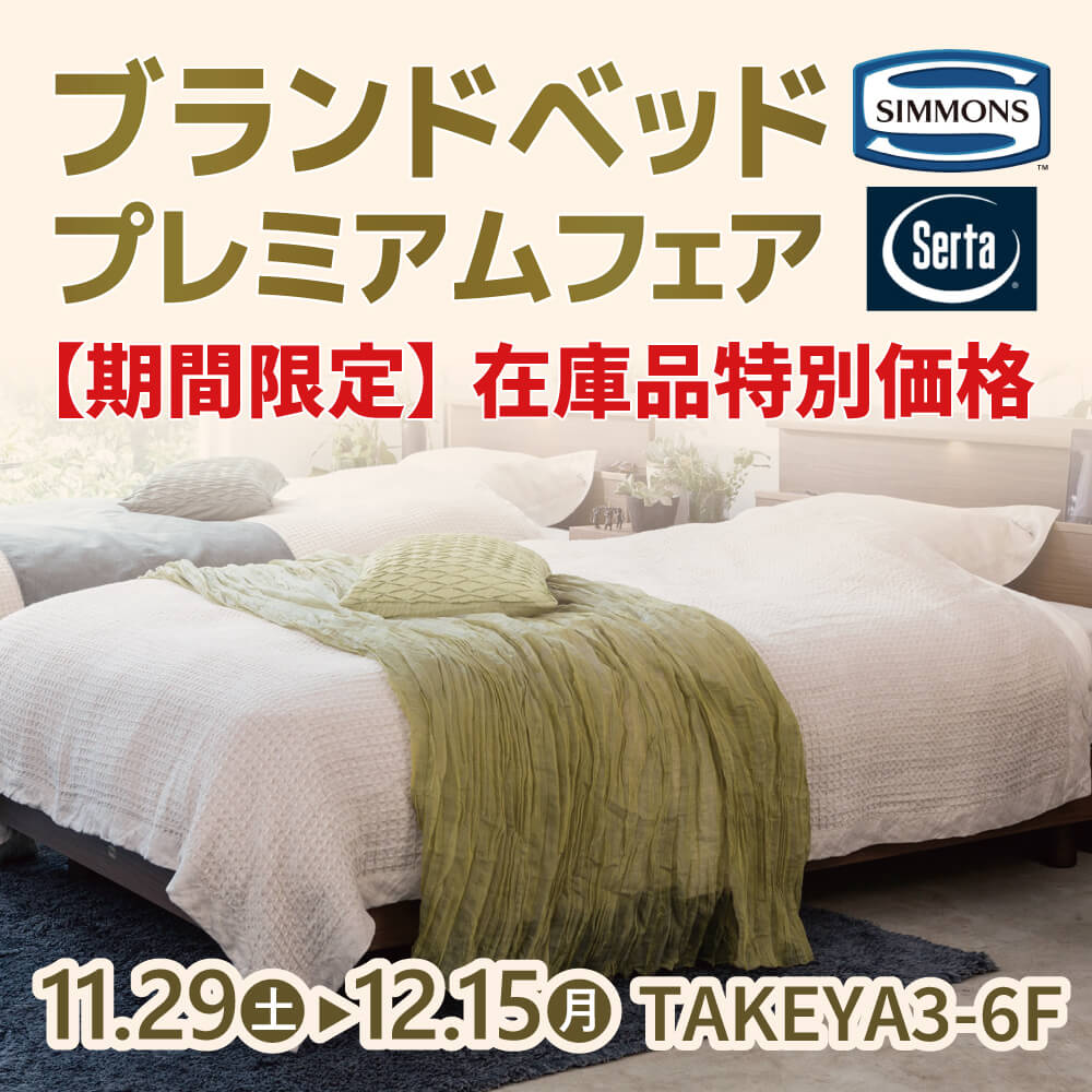 TAKEYA3-6Fベッド売場にて期間限定開催、シモンズ・サータベッドなど人気メーカーの商品を催事限定価格にて販売いたします。催事限定のおトクな特典もご用意しておりますので、無料招待状をお申込みの上ぜひご来店ください。