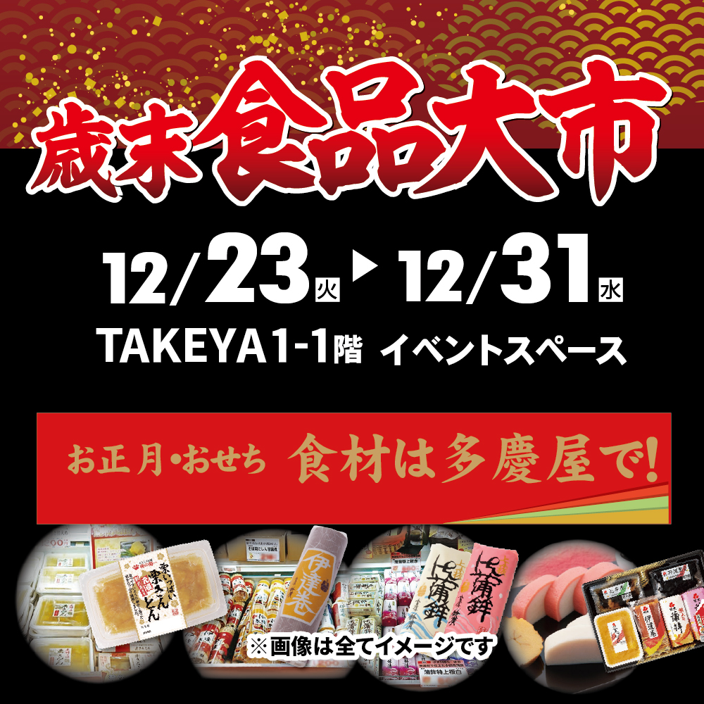 年末年始の食卓を彩る“旨いもの”大集合。一年の締めくくりは豪華に!歳末食品大市 開催■開催日 2025年12月23日(火)~12月31日(水)9:00AM~10:00PM※12月31日(水)は8:00PM閉店■場所 TAKEYA1-1階イベントスペース