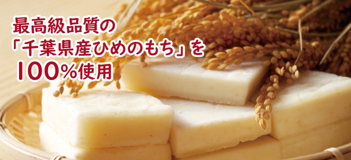 最高級品質の「千葉県産ひめのもち」を100%使用。比較的あっさりとしていてクセがないため、お餅にすることによりお米そのもの良さを味わっていただけます。